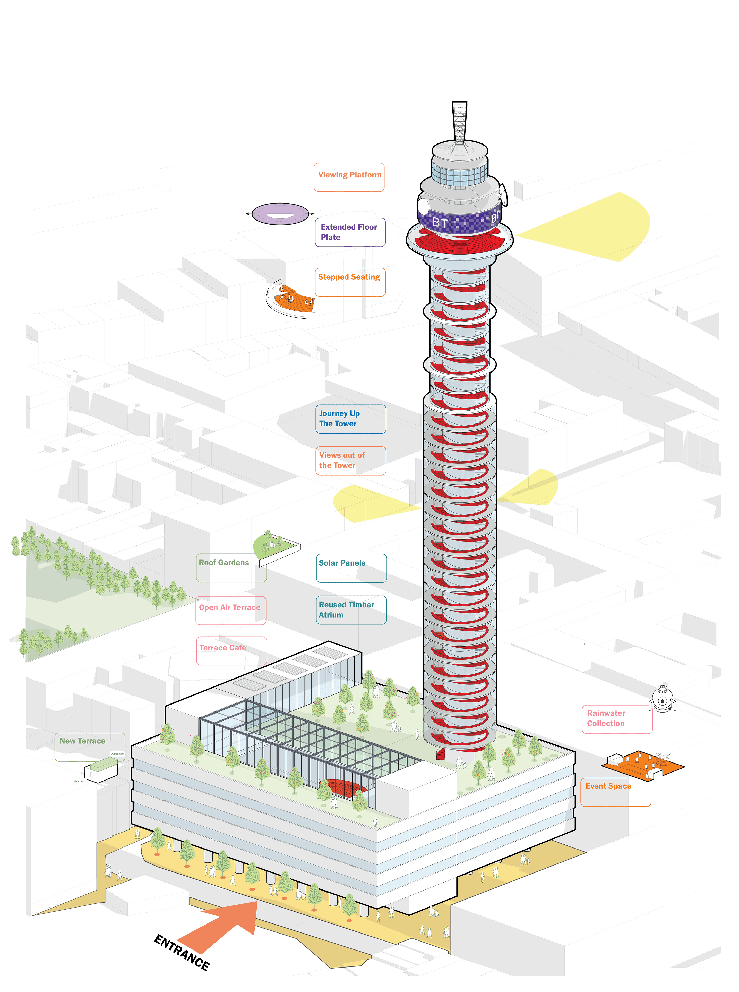 One of the greatest visitor experiences in the world. Accessed via a podium housing retail, hospitality and office, visitors emerge onto the roof garden where they see the re-imagined tower above them. A spiralling pedestrian route encased in mesh leads the visitor around the existing structure, with places to pause and enjoy the view.