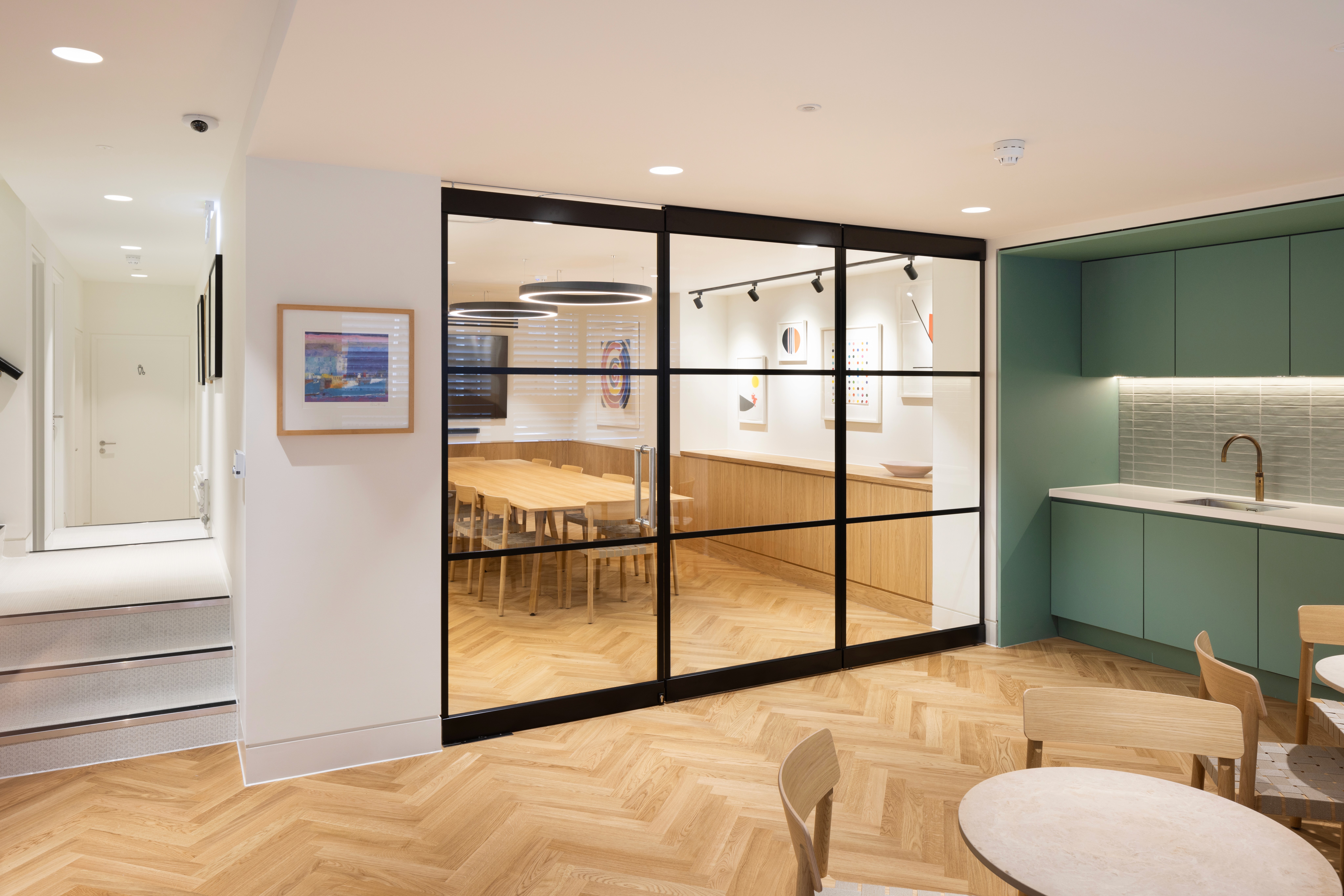 The new scheme provides a ‘Wow’ moment on arrival turning an under utilised reception area into a thriving coffee and co-working space for all. We have integrated the disused garage space into a versatile entertaining / reception space which can be closed off for separate meetings during the working week.