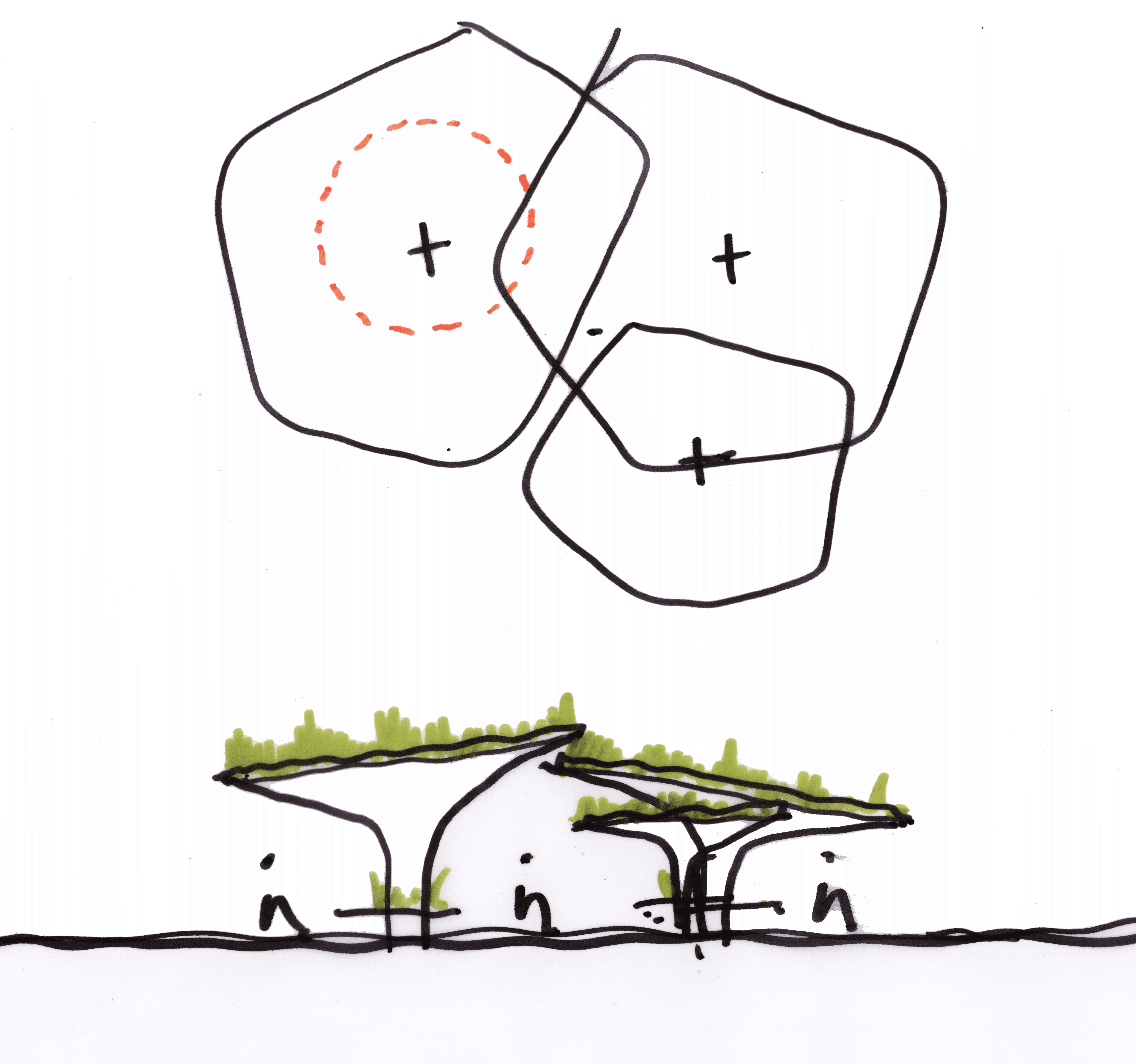 We created a series of shelters around the idea of a tree canopy, providing shelter, natural materials, greening and a human-centric place for people to be.