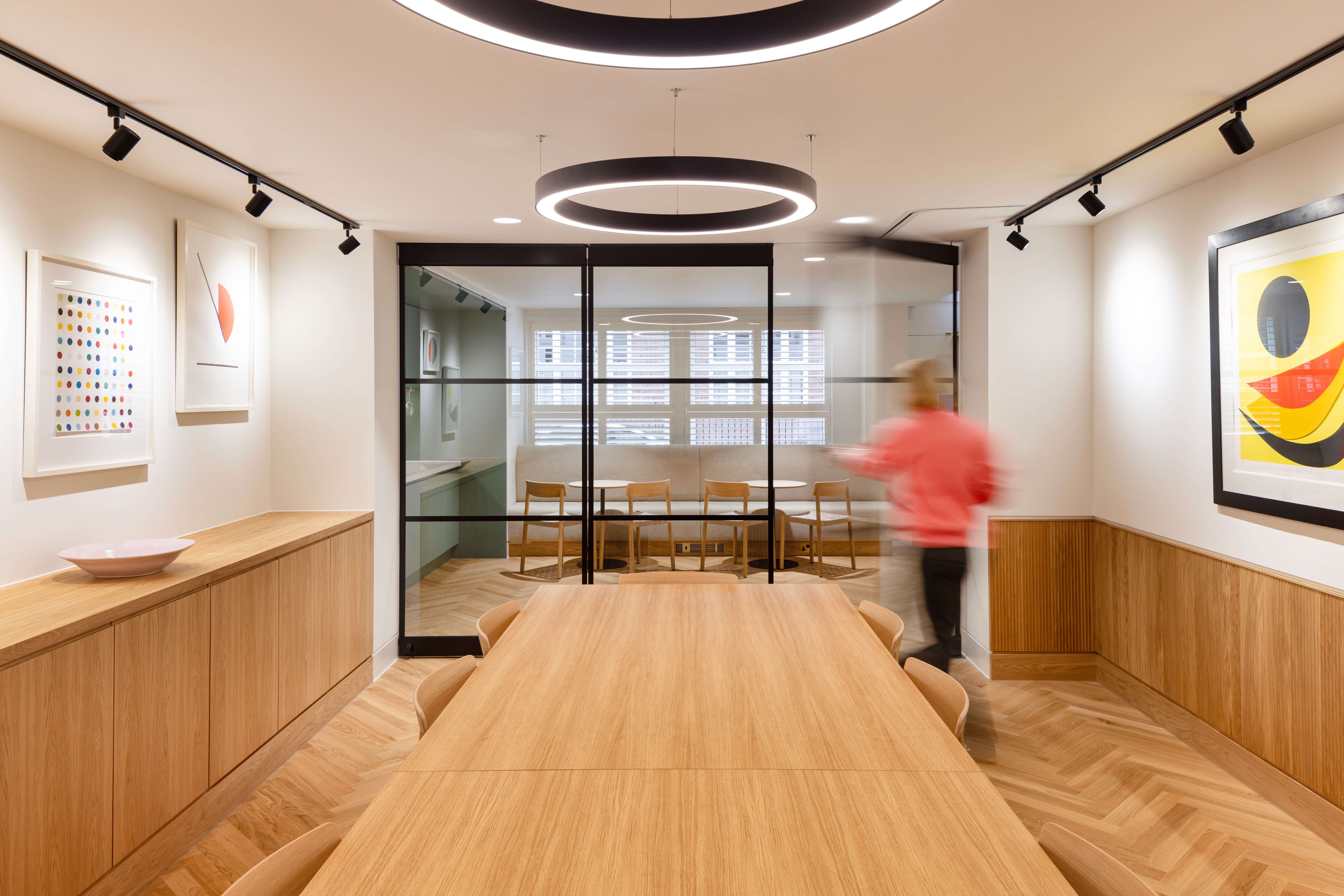 The new scheme provides a ‘Wow’ moment on arrival turning an under utilised reception area into a thriving coffee and co-working space for all. We have integrated the disused garage space into a versatile entertaining / reception space which can be closed off for separate meetings during the working week.