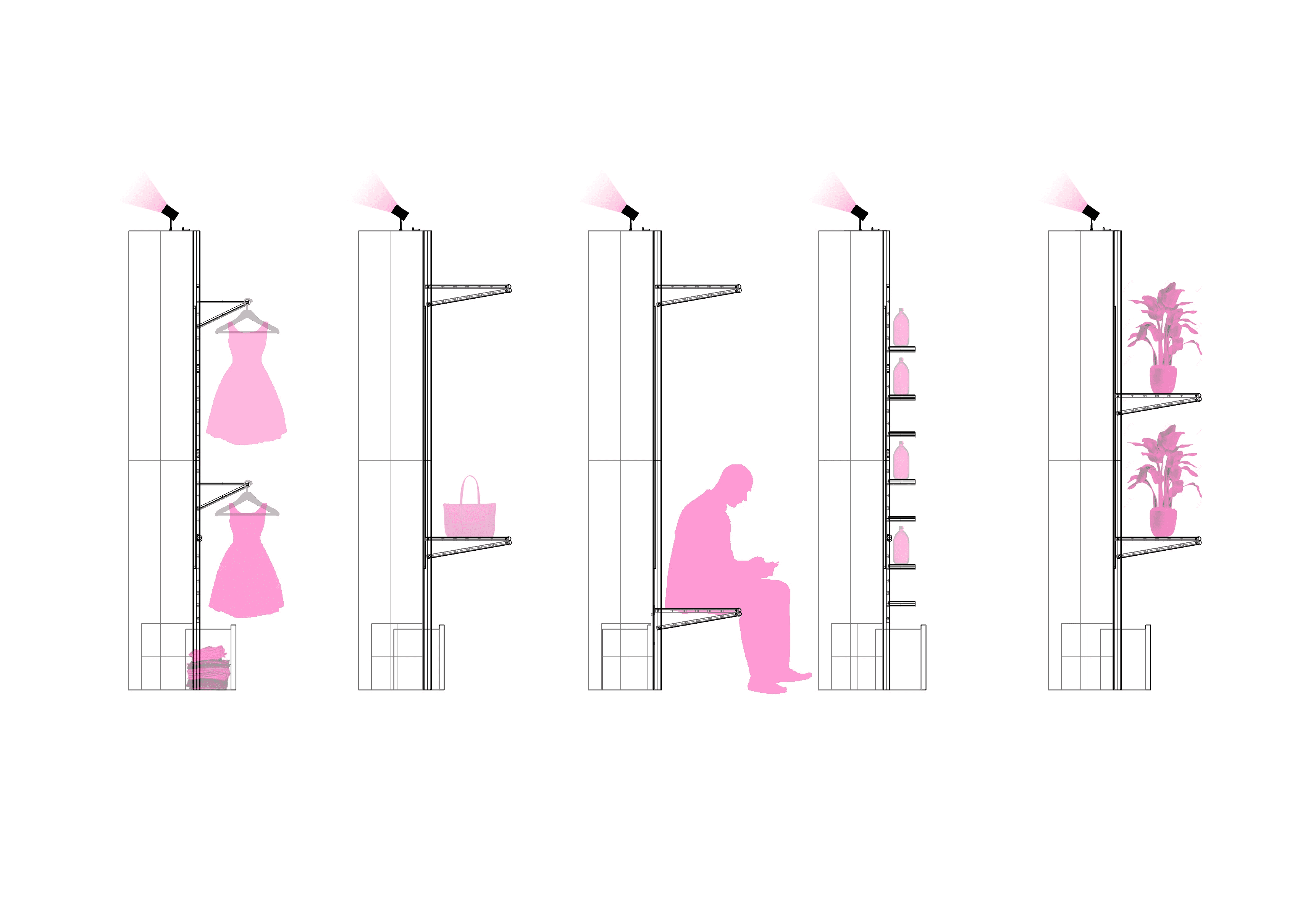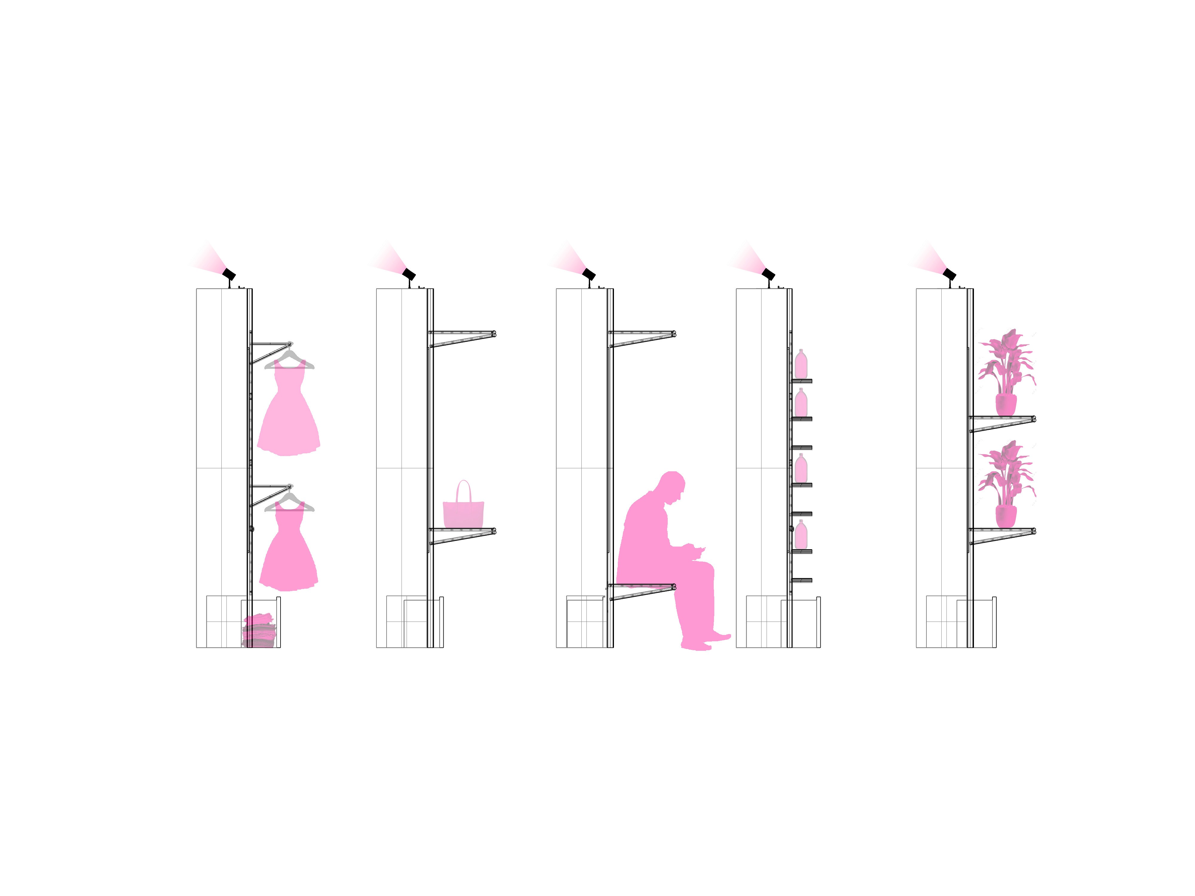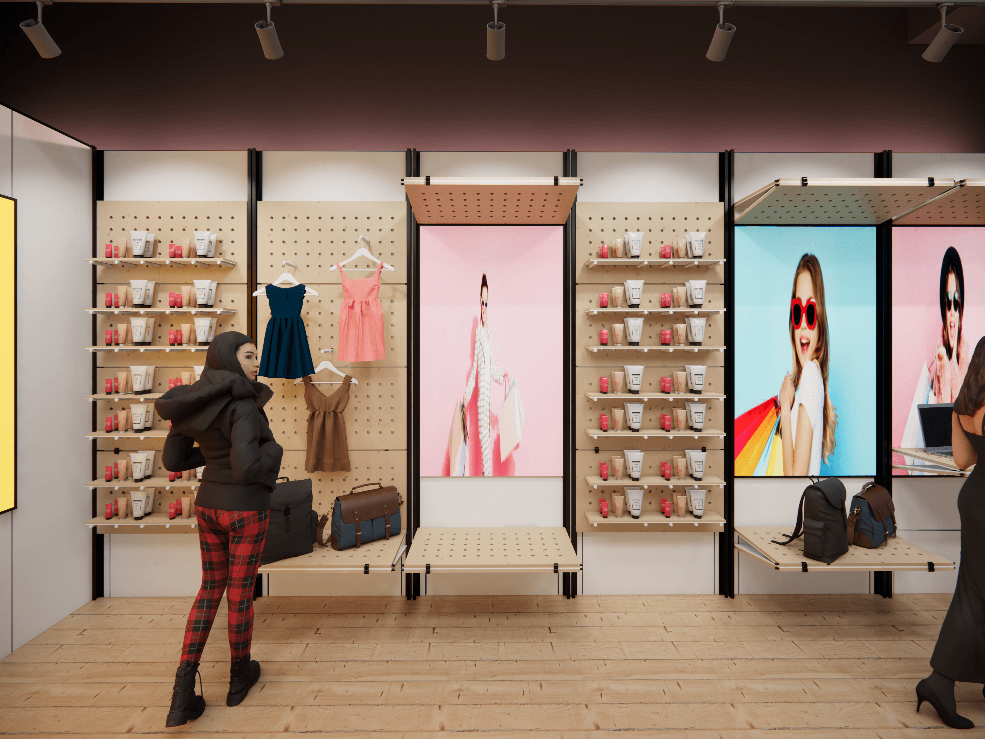 Our proposal includes multi-use panels that reveal digital displays and can be configured in endless ways to display any product imaginable.