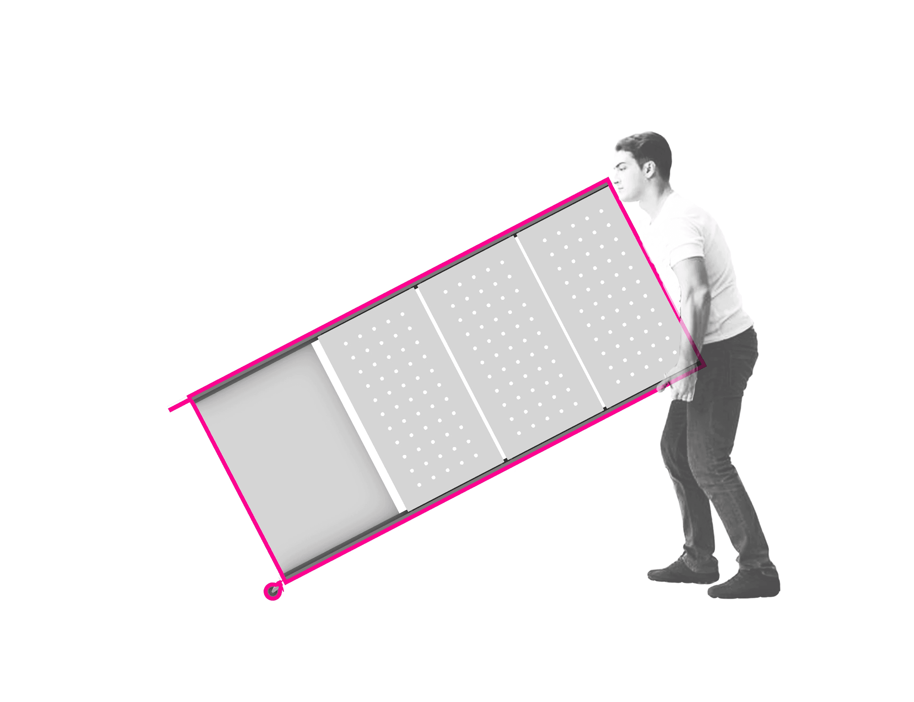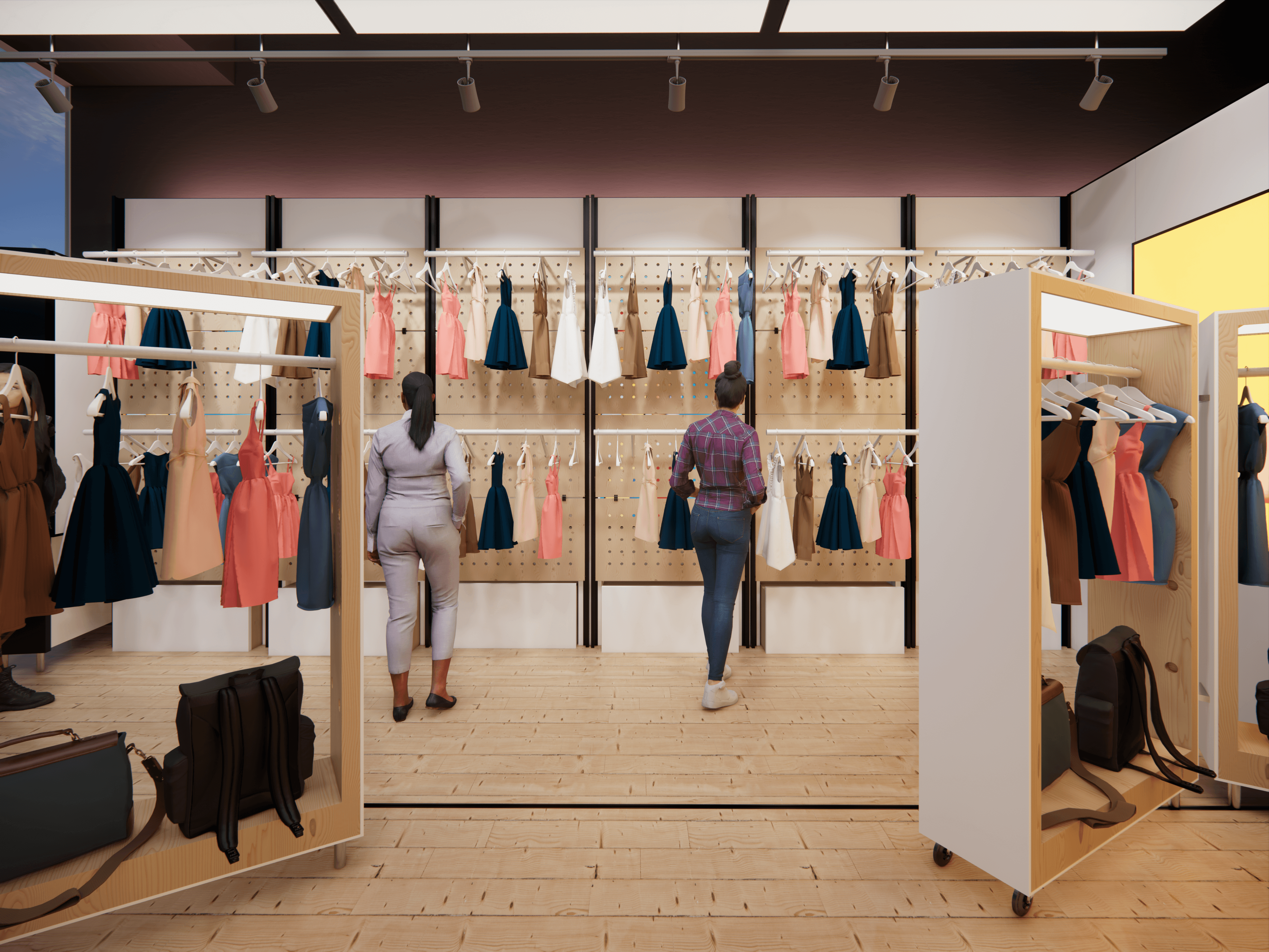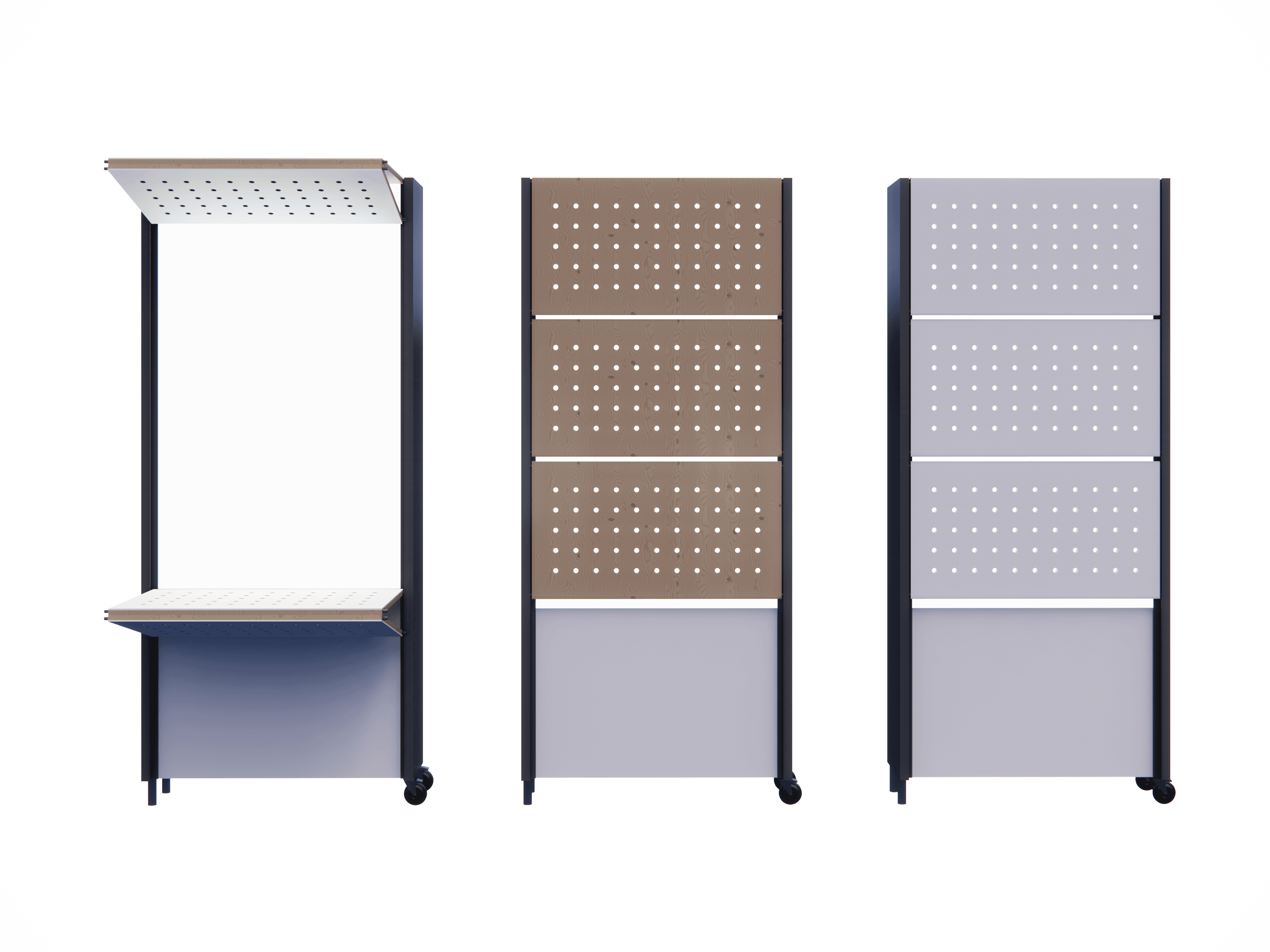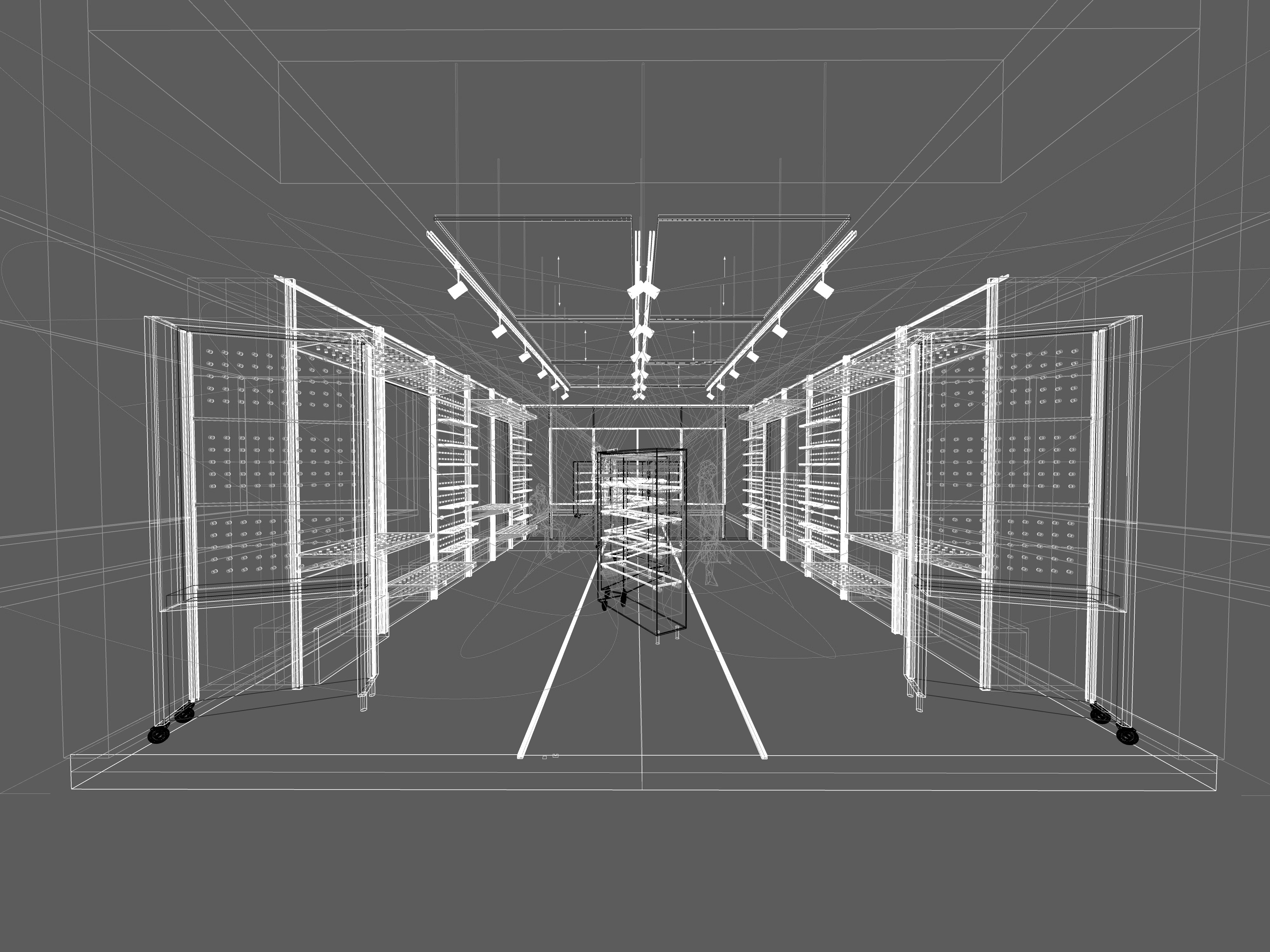 Our proposal includes multi-use panels that reveal digital displays and can be configured in endless ways to display any product imaginable.