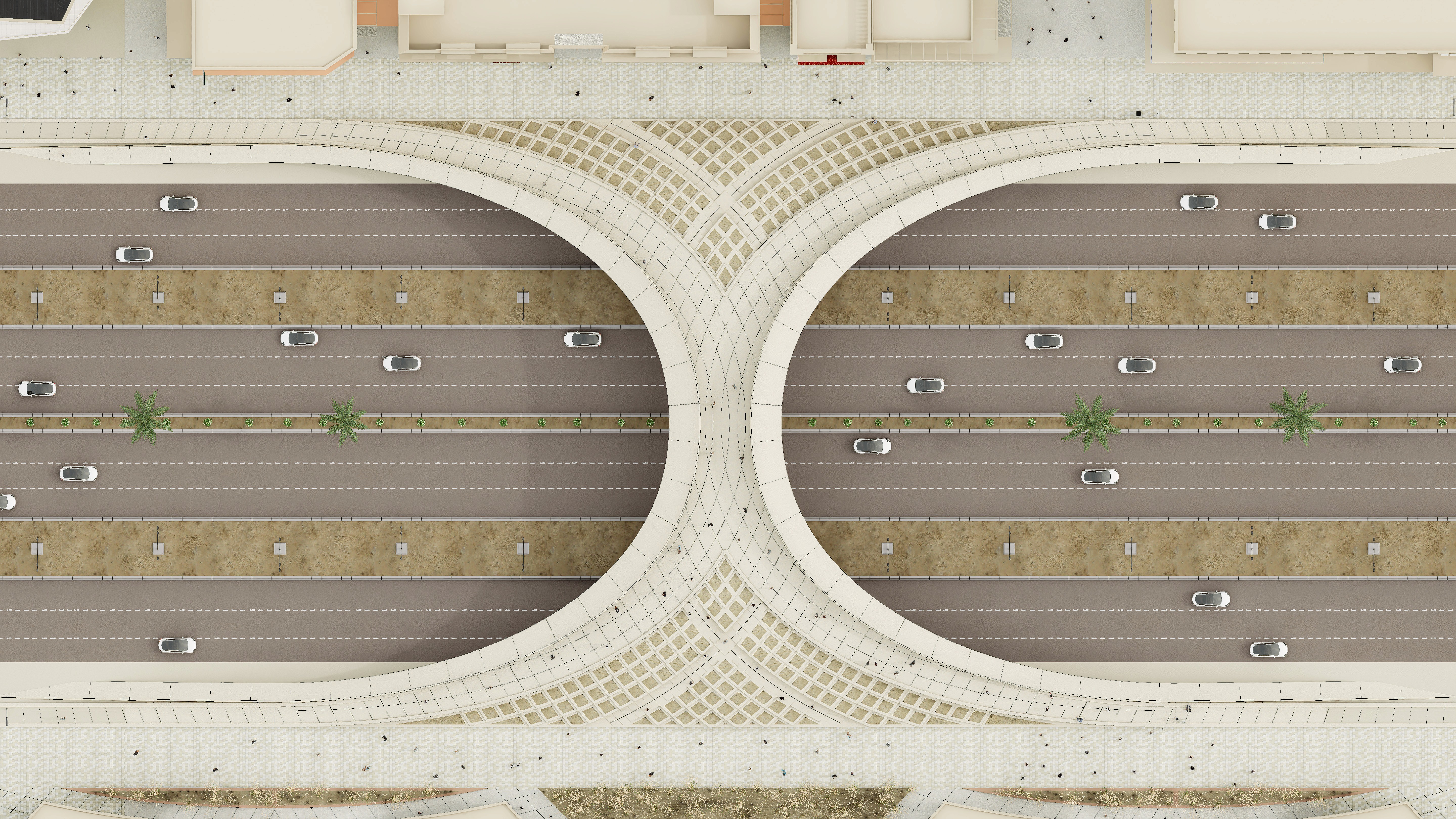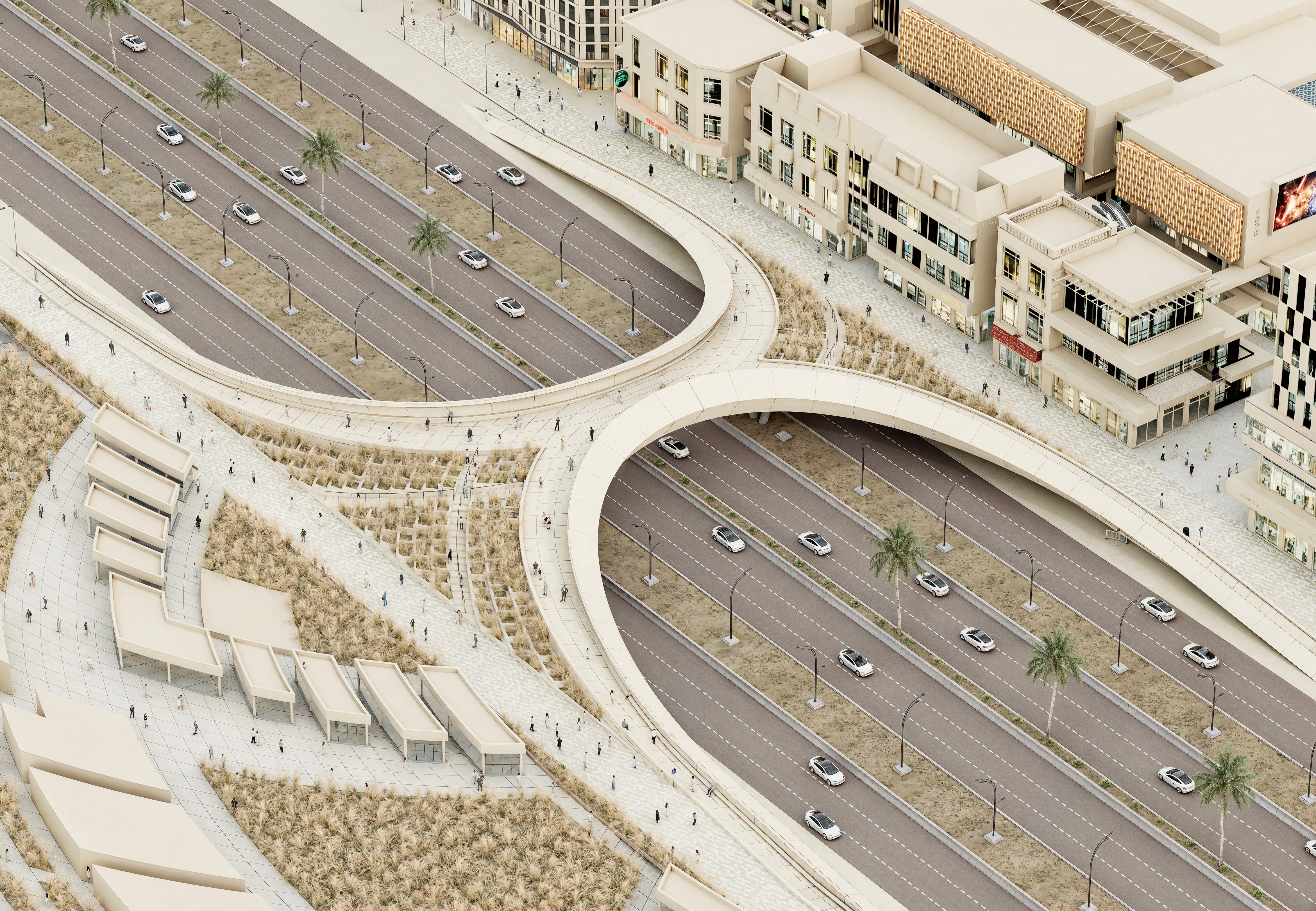 An innovative pedestrian footbridge inspired by the iconic sand dunes of Saudi Arabia to transform Highway 65 from a barrier into a dynamic connection between the East and West sides of Riyadh.