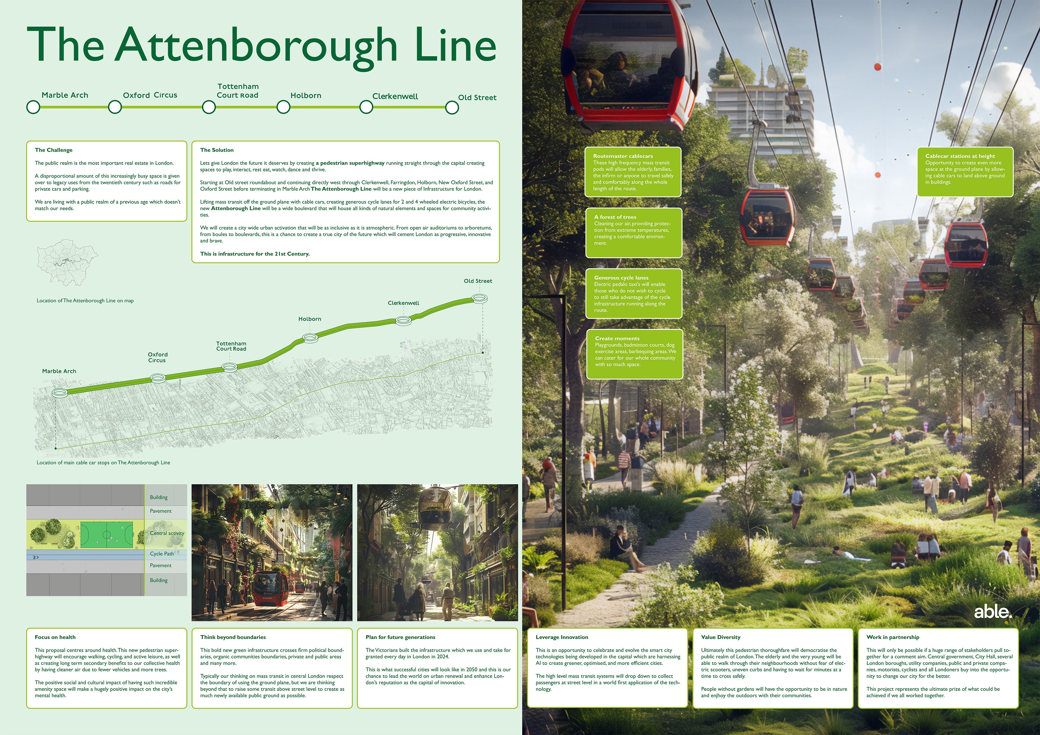 Lifting mass transit off the ground plane with cable cars, creating generous cycle lanes for 2 and 4 wheeled electric bicycles, the new ATTENBOROUGH LINE will be a wide boulevard that will house all kinds of natural elements and spaces for community activities. We will create a city-wide urban activation that will be as inclusive as it is atmospheric. From open-air auditoriums to arboretums, from boules to boulevards, this is a chance to create a true future city that will cement London as progressive, innovative and brave.